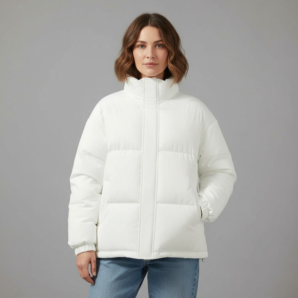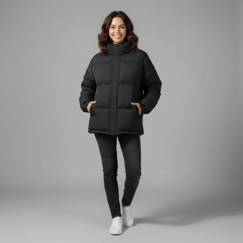 Ta puchowa kurtka zimowa zapewnia wyjątkowe ciepło i nowoczesny wygląd. Wysoki kołnierz chroni przed wiatrem, a lekka konstrukcja gwarantuje swobodę ruchu i komfort przez cały dzień.